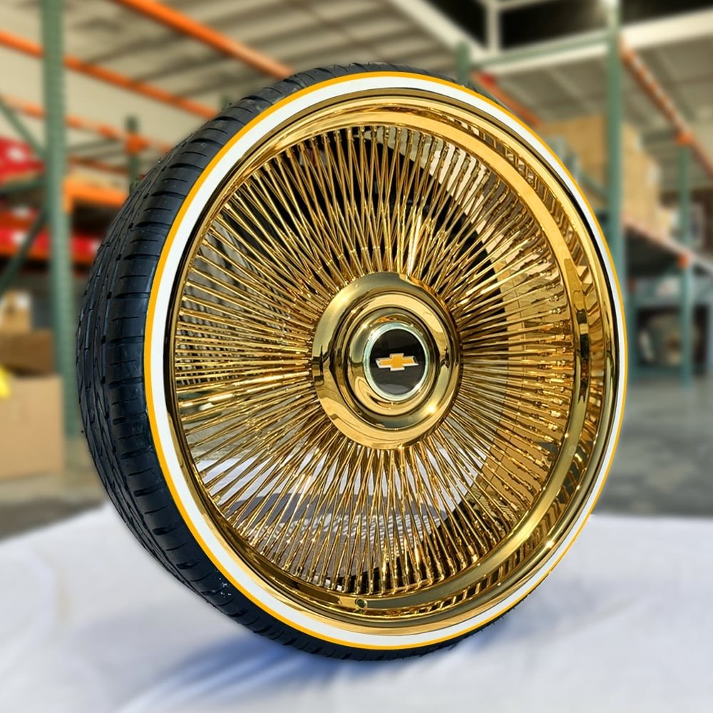 22”,24”,26″ Wire Wheels All Gold Staggered – Direct Bolt with 275/25R26 Whitewall Tires & Gold Stripe (Set of 4)